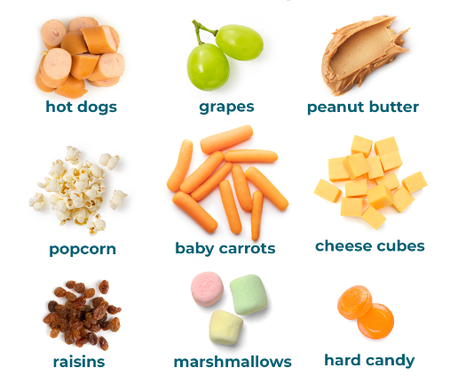 Do not give peanuts, whole grapes, cherry tomatoes, whole carrots, popcorn, whole hot dogs, hard candies unless cut into small pieces